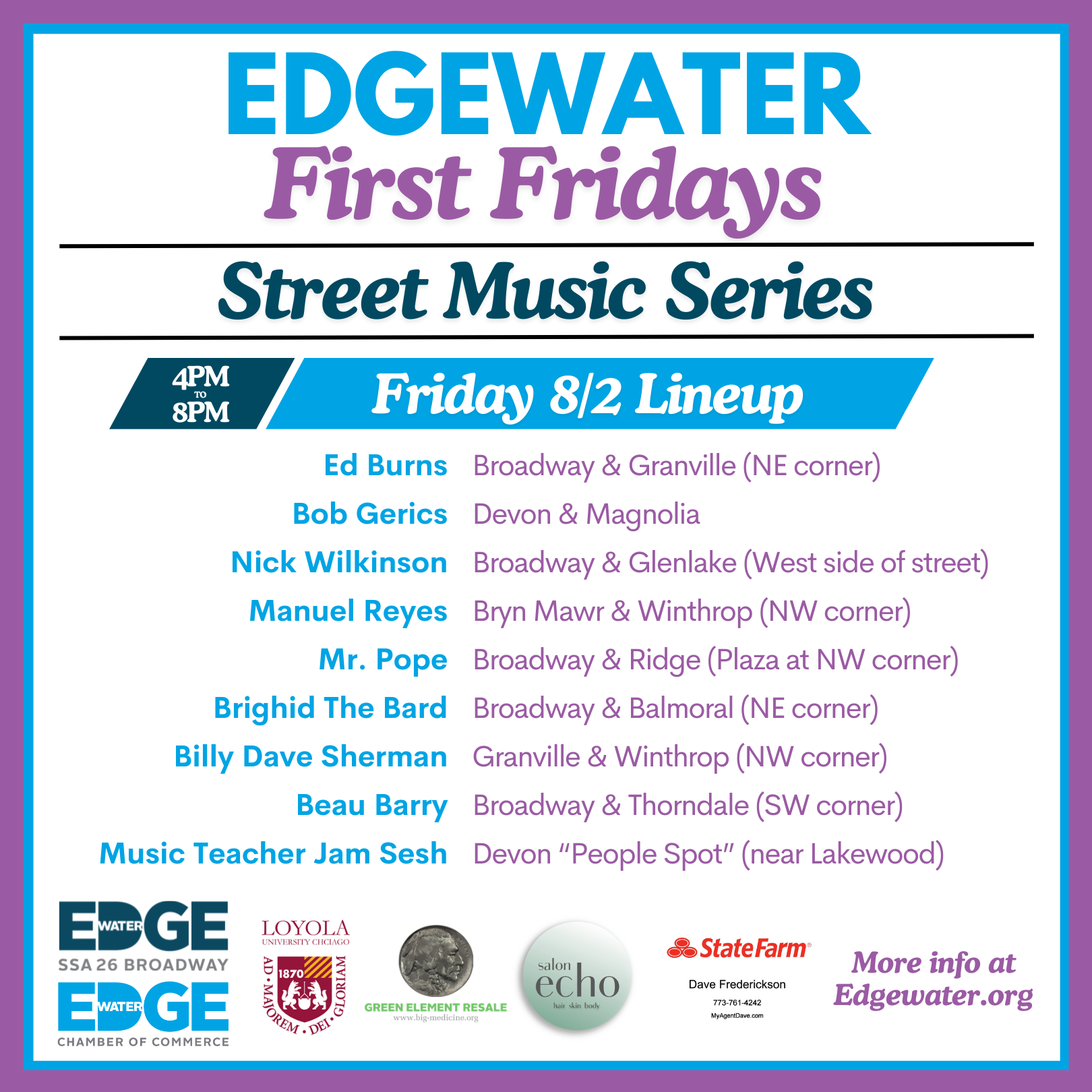 Edgewater SSA #26 and Edgewater Chamber of Commerce are teaming up to bring dozens of street musicians to our business corridors the first Friday of the month in August, September and October of 2024.